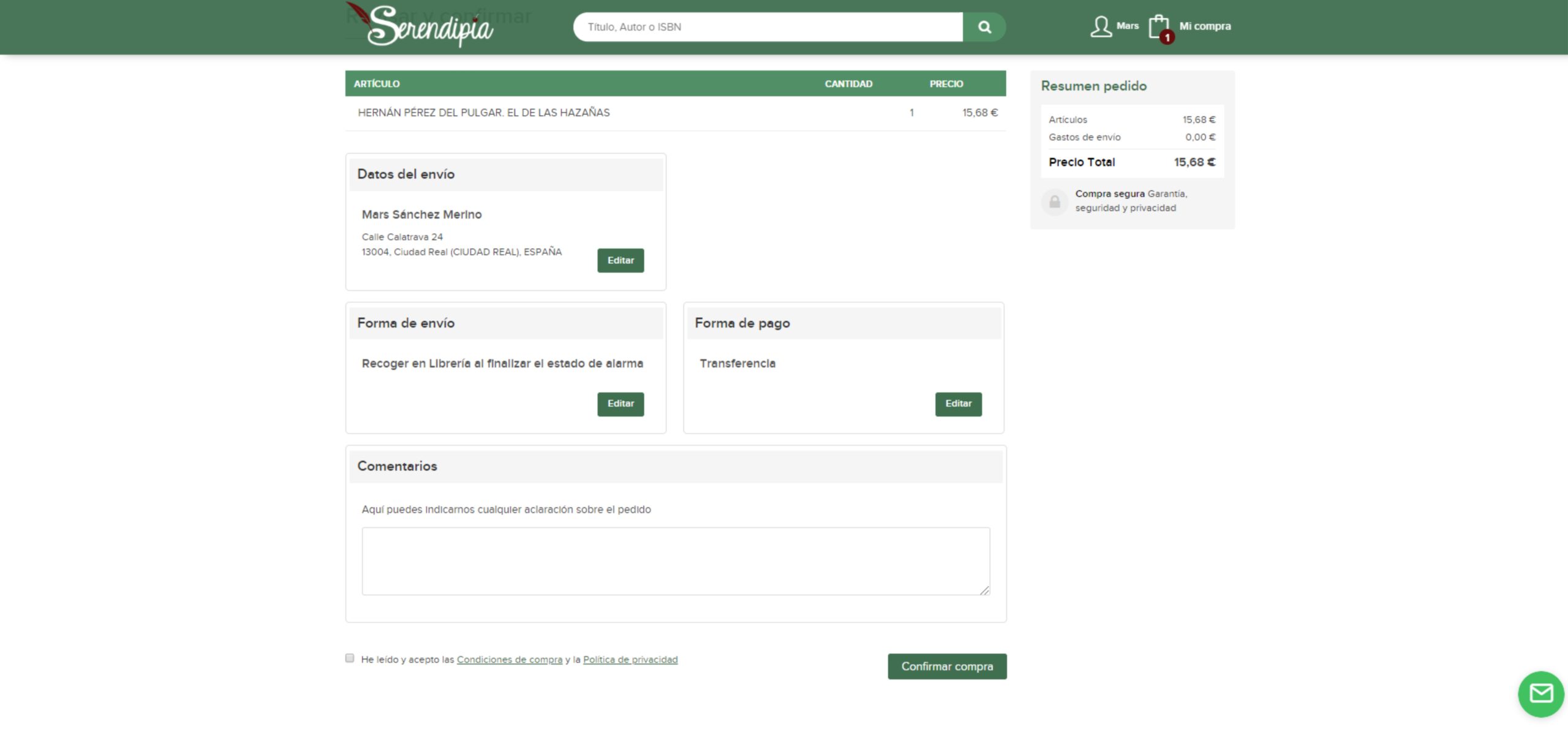 Antes de terminar el pedido, nos queda un paso muy importante. Comprobar que todo está correcto: los artículos que queremos, el tipo de envío, la forma de pago, la dirección… Y señalar en observaciones cualquier cosa adicional que se necesite para el envió como por ejemplo «envolver para regalo»…
